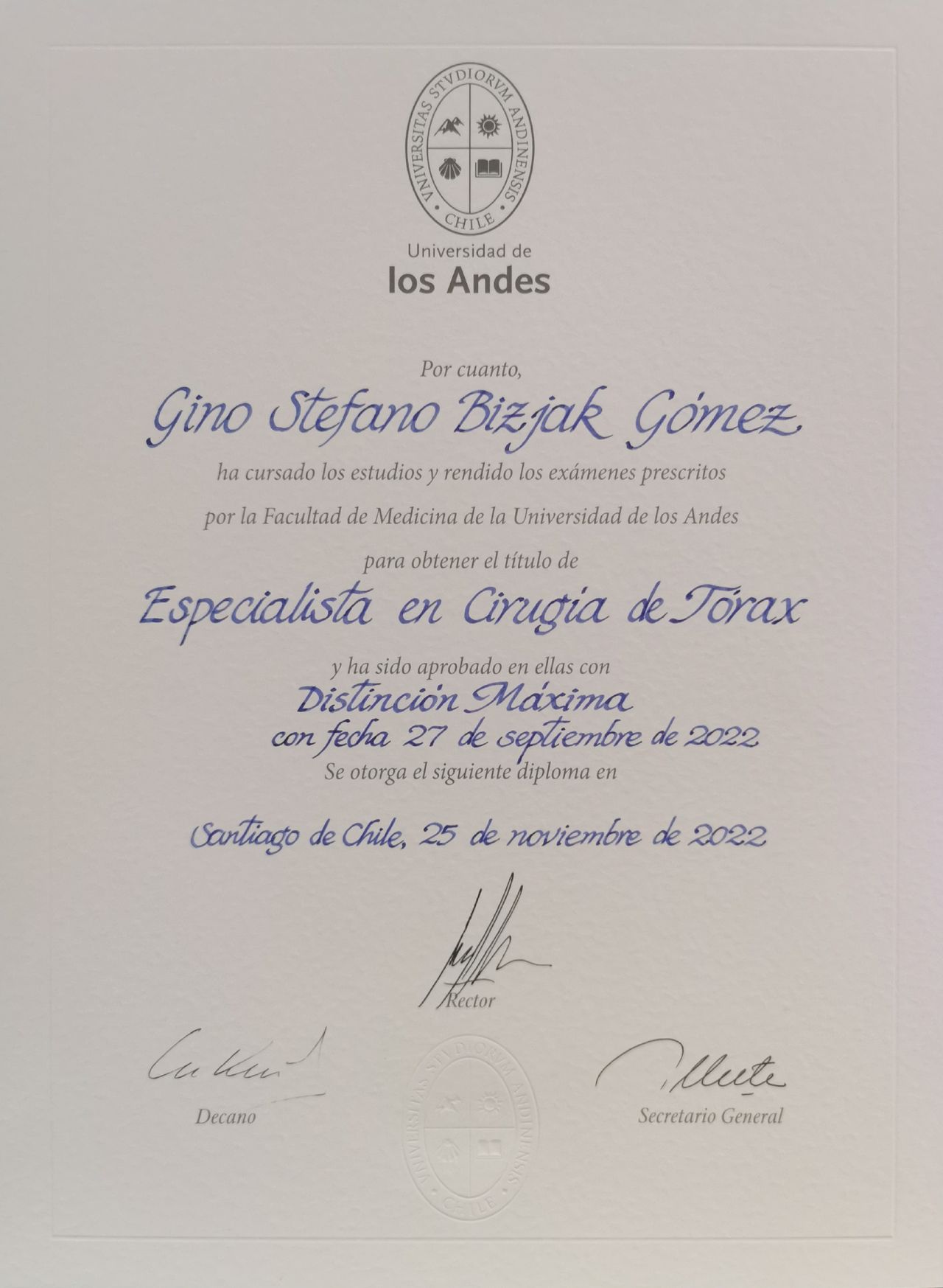 - Universidad De Los Andes. 2019-2022. Cirugía de tórax - Distinción máxima
