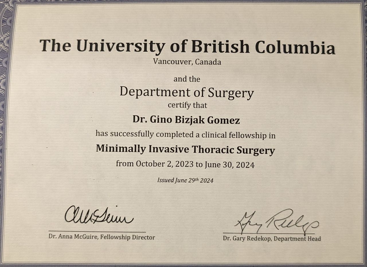 - University of British Columbia. Canadá, 2023-2024. Cirugía torácica oncológica mínimamente invasiva.